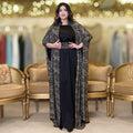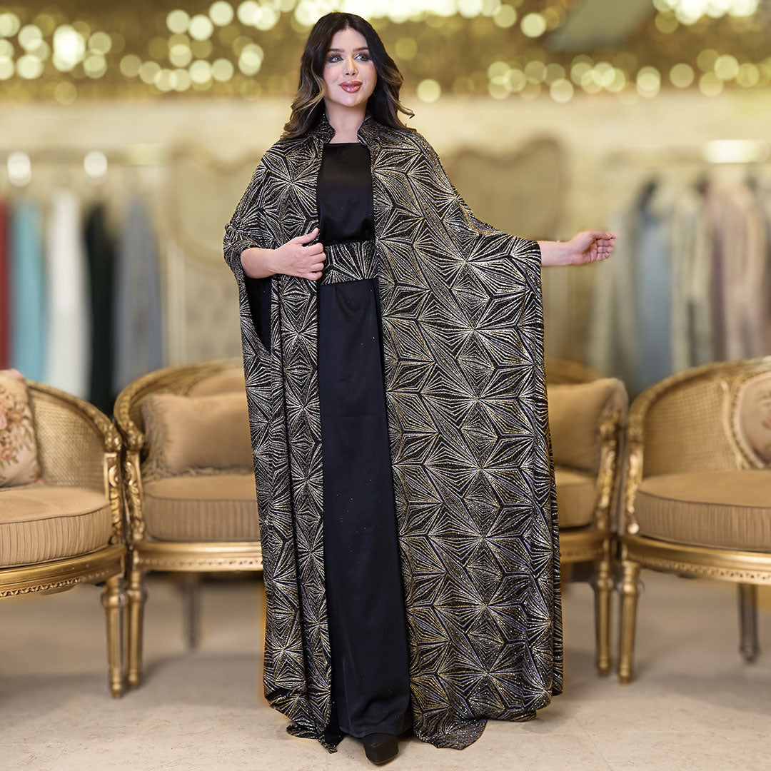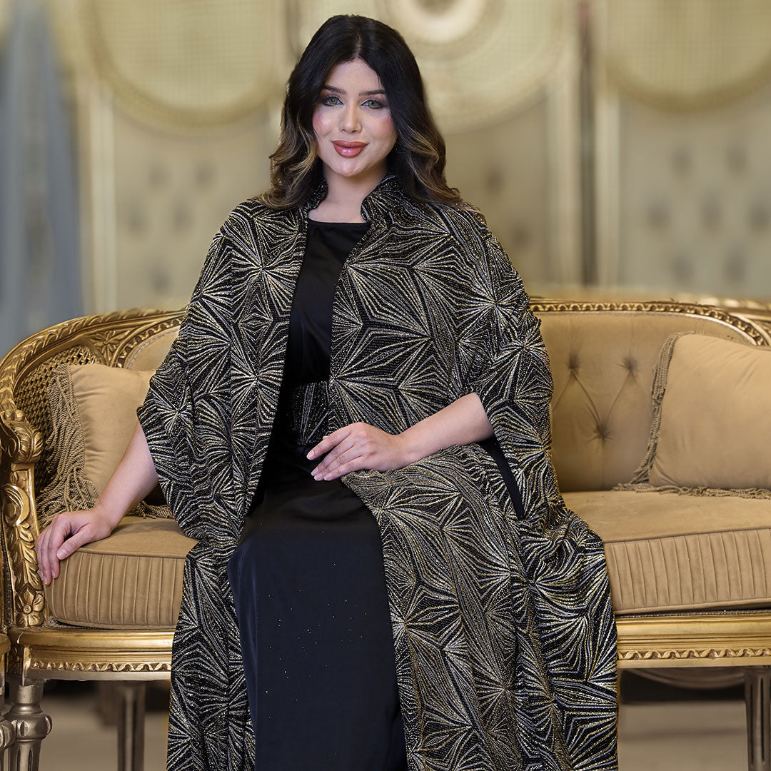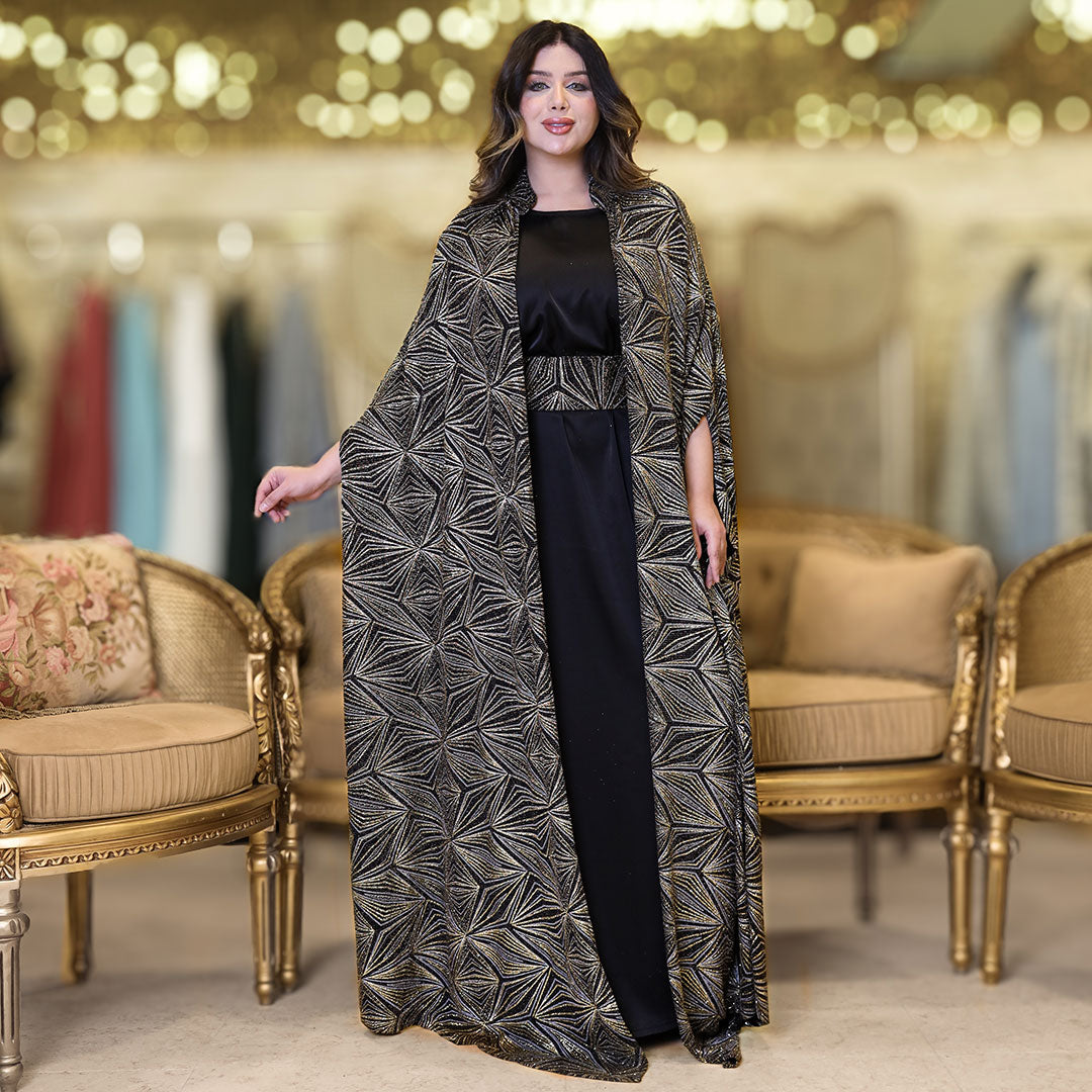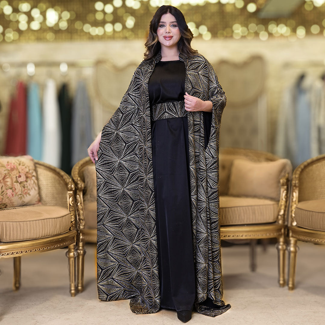 This elegant Soirée gown is adorned with shiny crystal embellishments, paired with a matching belt to highlight a central arabic design.