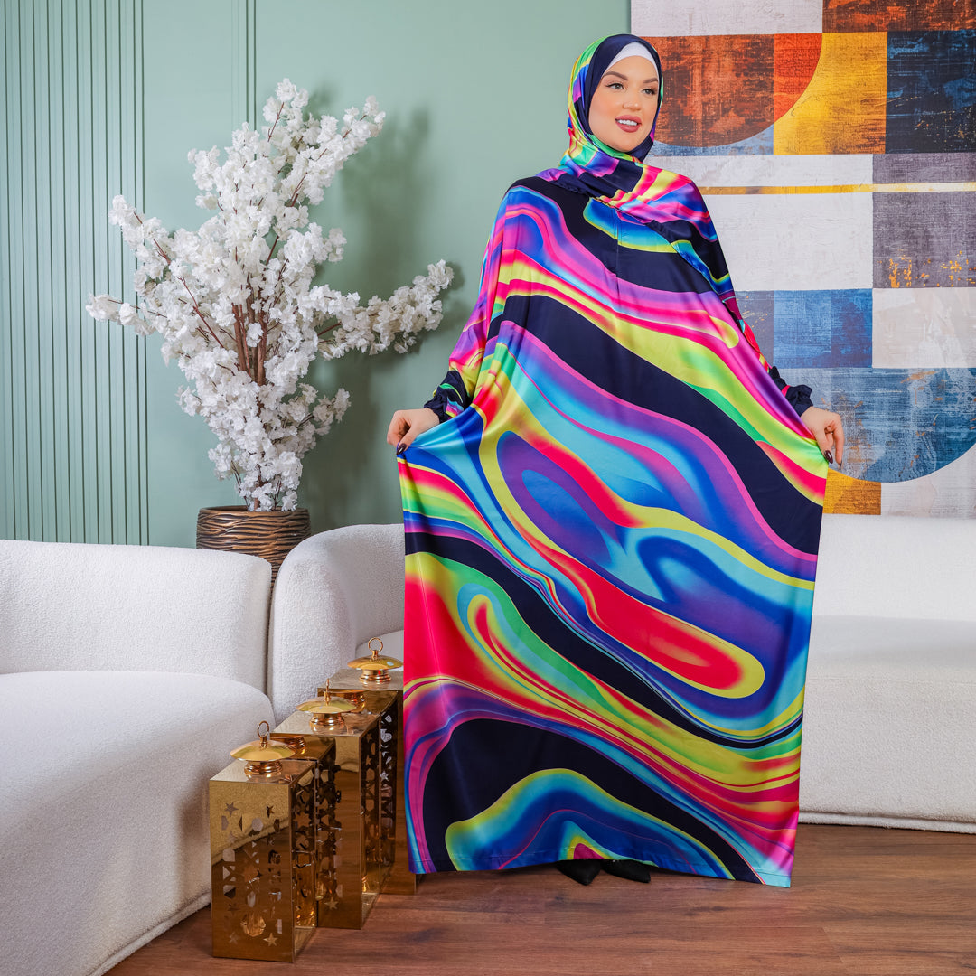 Practical Silky Satin prayer dress (Isdal) (digital print our own designs) Free Size fits 70kg to 130kg With a connected veil