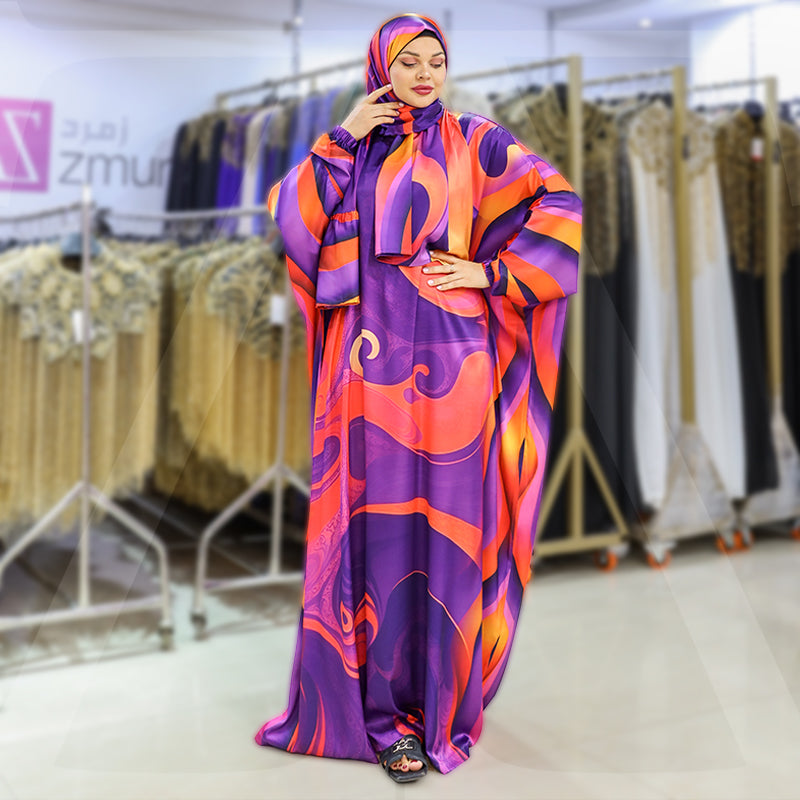 Practical Silky Satin prayer dress (Isdal) (digital print our own designs) Free Size fits 70kg to 130kg With a connected veil