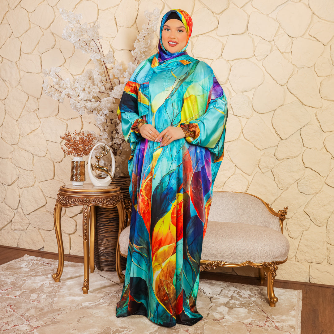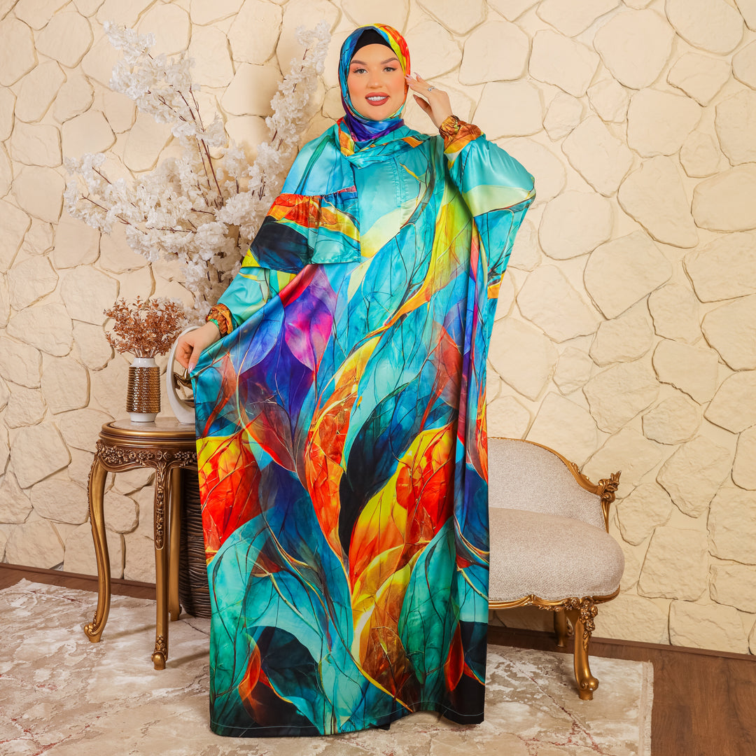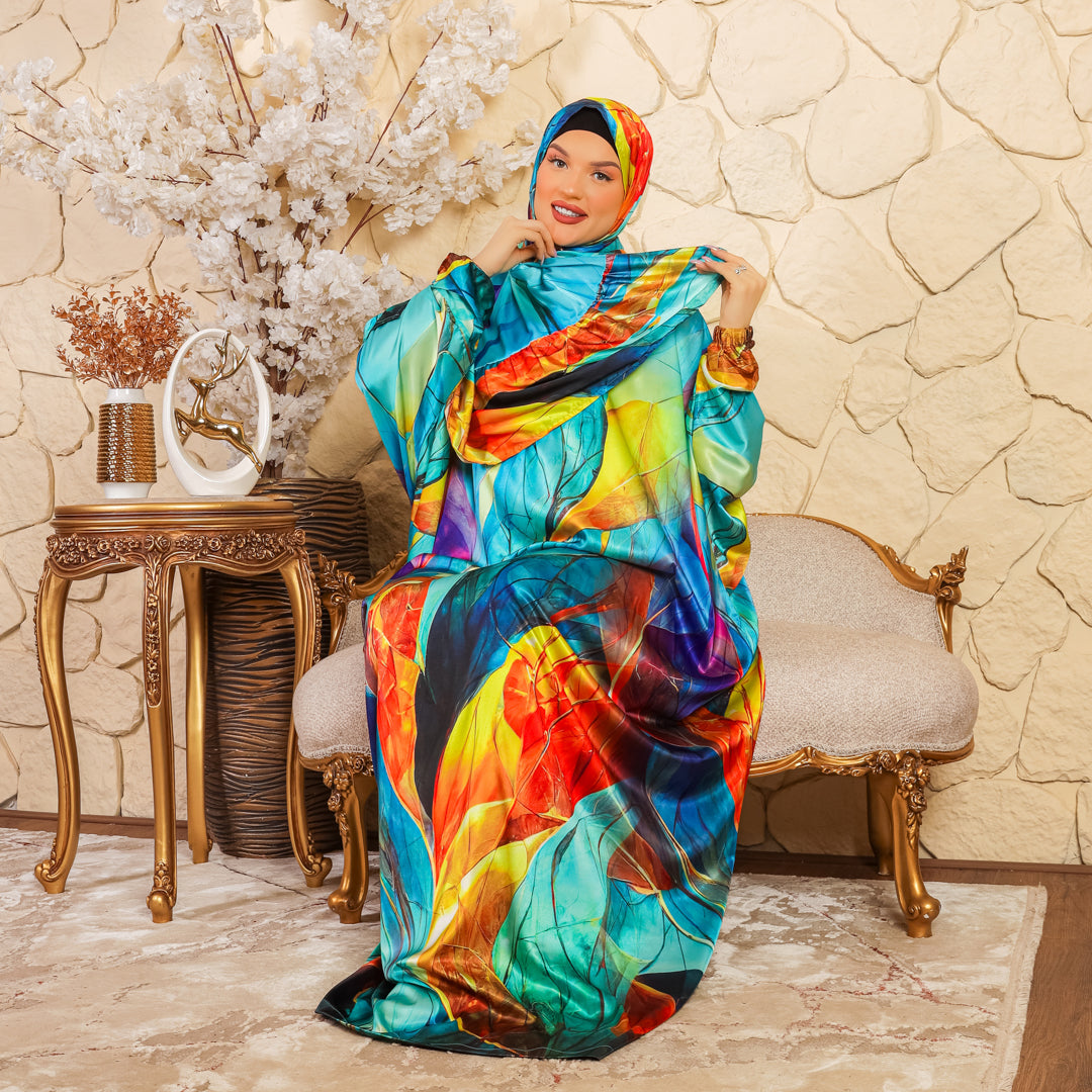 Practical Silky Satin prayer dress (Isdal) (digital print our own designs) Free Size fits 70kg to 130kg With a connected veil