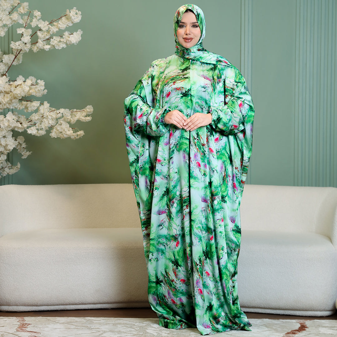 Practical Silky Satin prayer dress (Isdal) (digital print our own designs) Free Size fits 70kg to 130kg With a connected veil