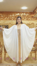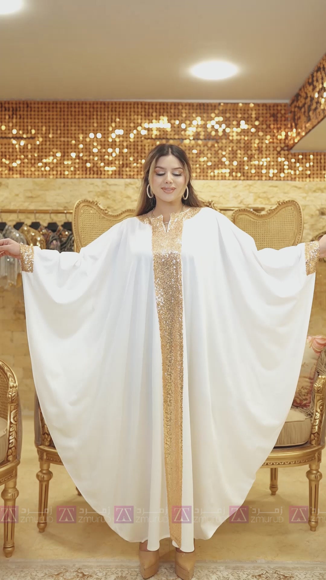 Jalabiya made of Lycra crepe with longitudinal sequin embroidery, free size, fits 70 kg to 130 kg, and length from shoulder 145 cm.