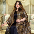 This elegant Soirée gown is adorned with shiny crystal embellishments, paired with a matching belt to highlight a central arabic design.