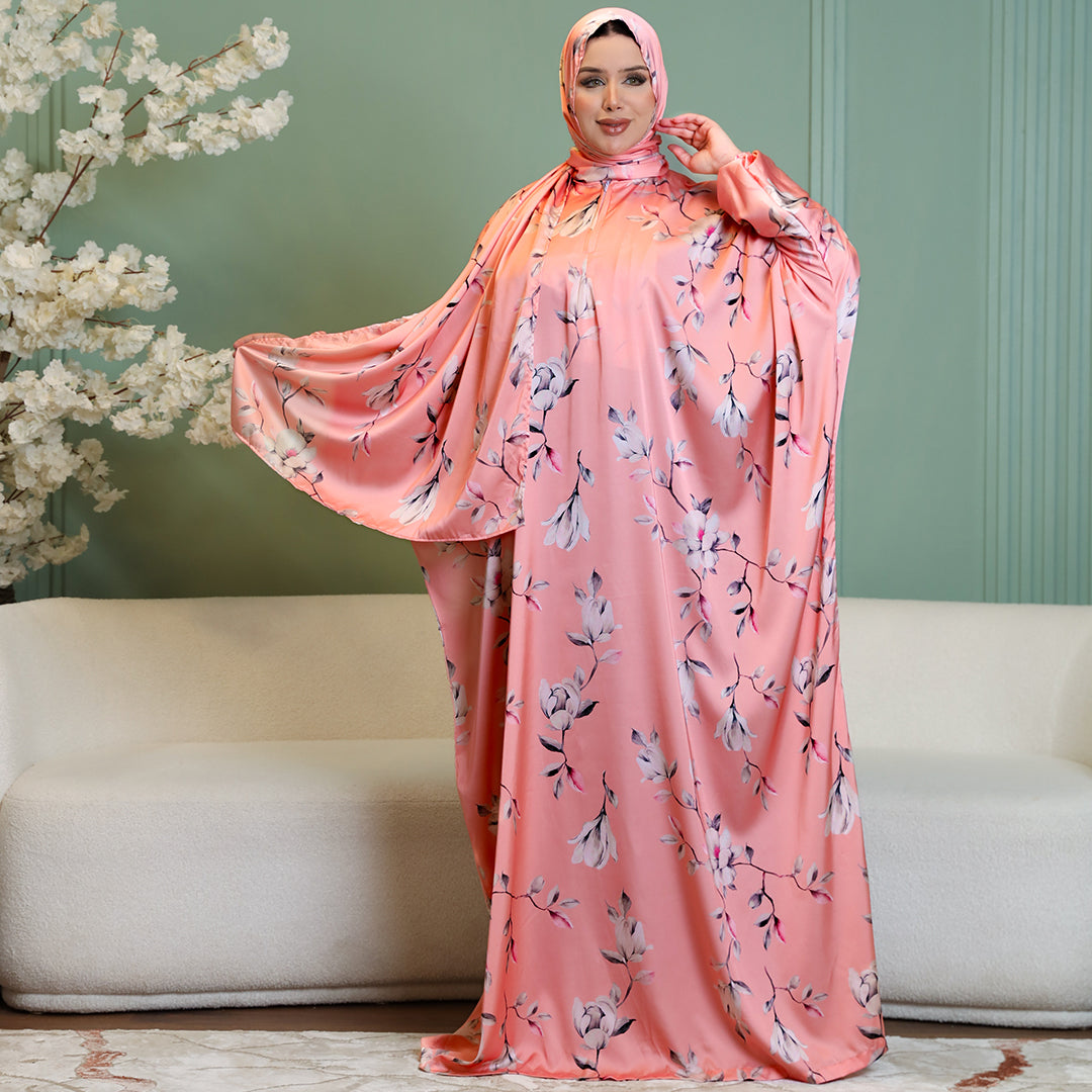 Practical Silky Satin prayer dress (Isdal) (digital print our own designs) Free Size fits 70kg to 130kg With a connected veil