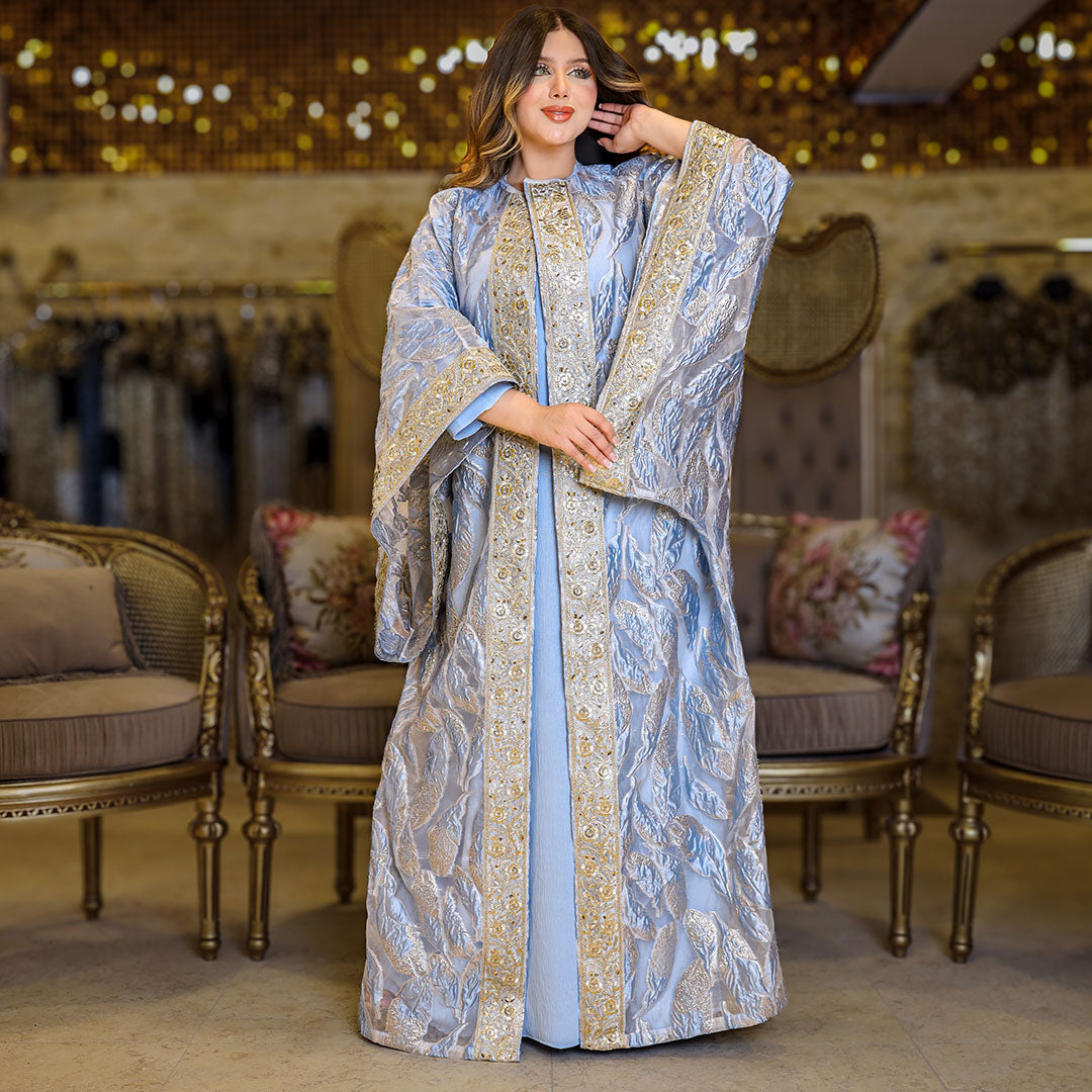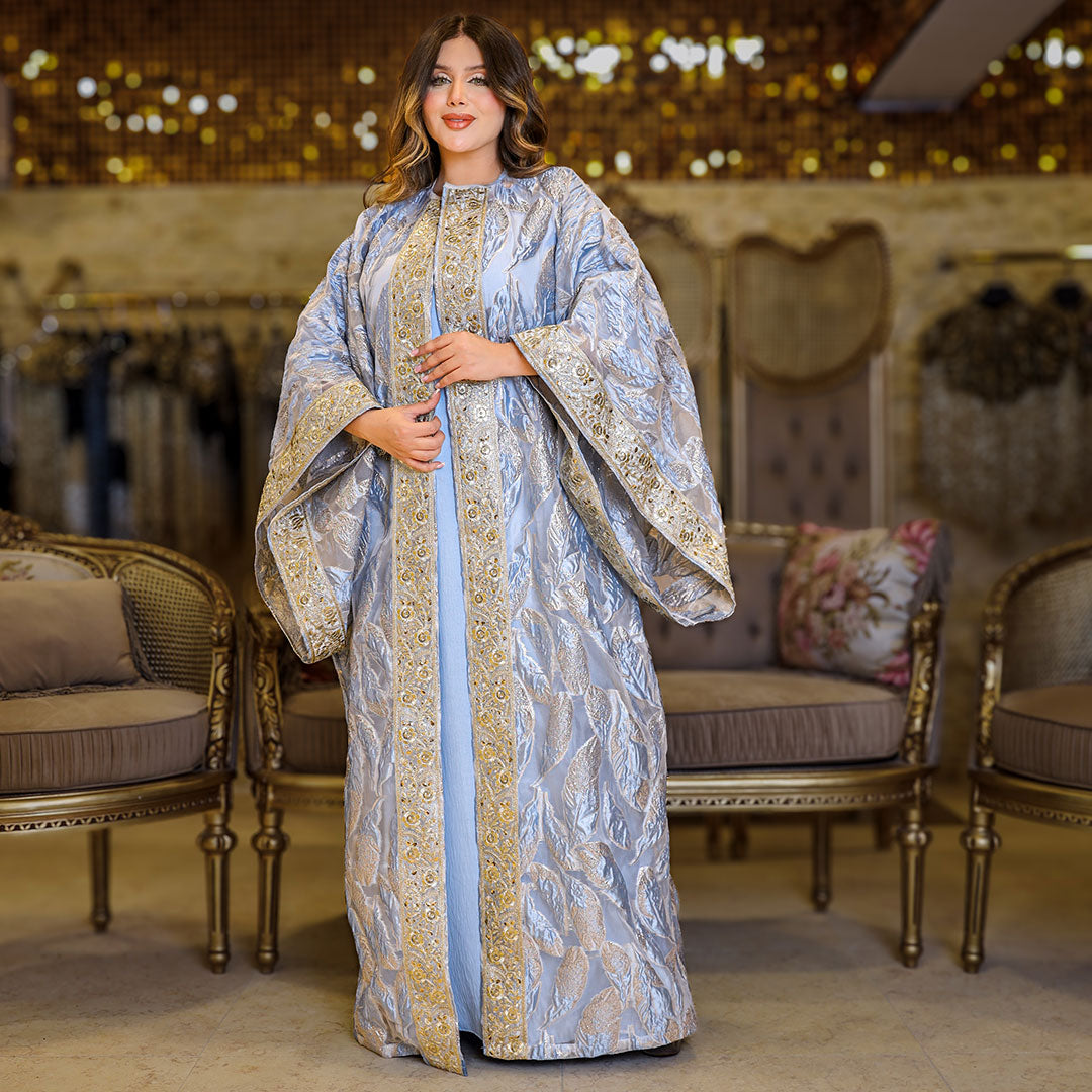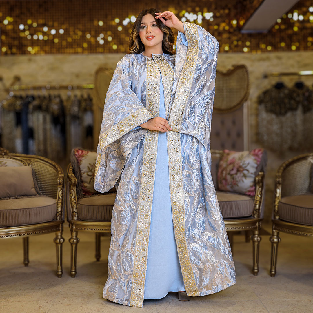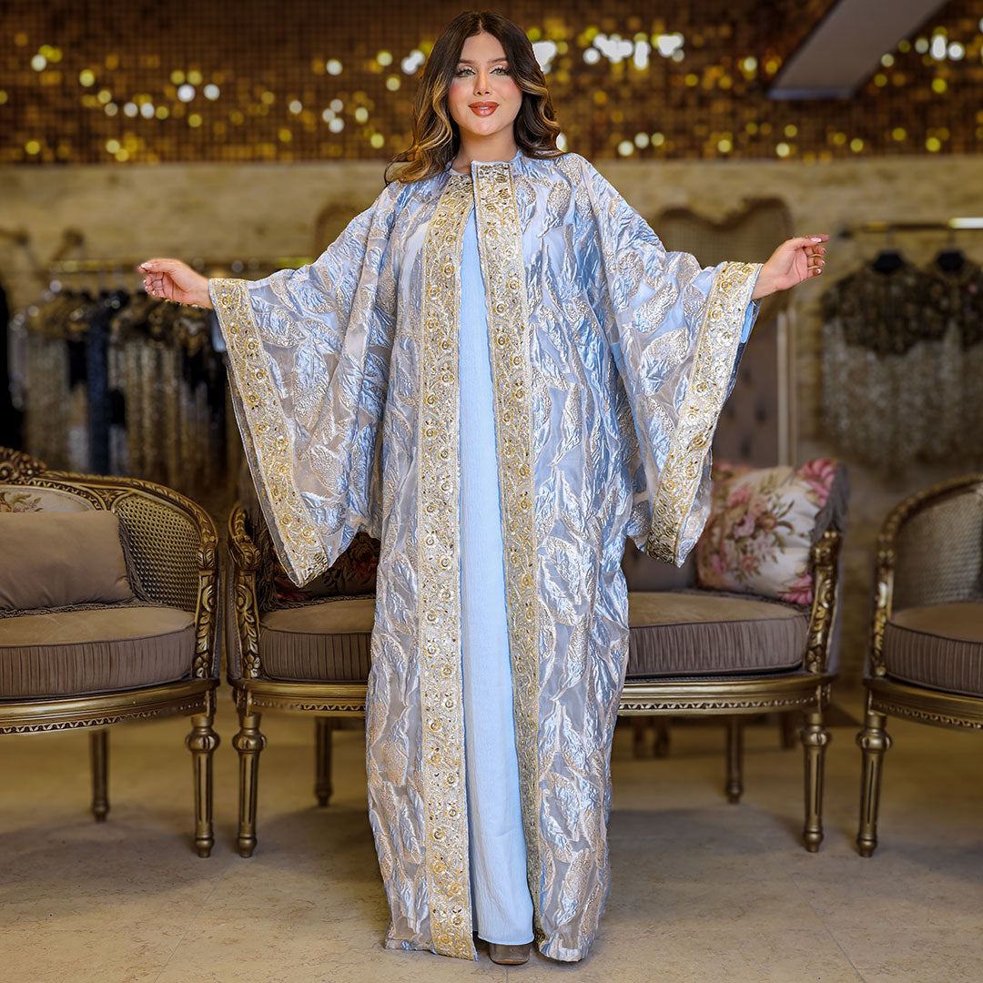 قفطان بحريني من قماش البروكار المطرز و شريط هندي تطريز - فري سايز يناسب ٧٠ك إلى ١٣٠ك
