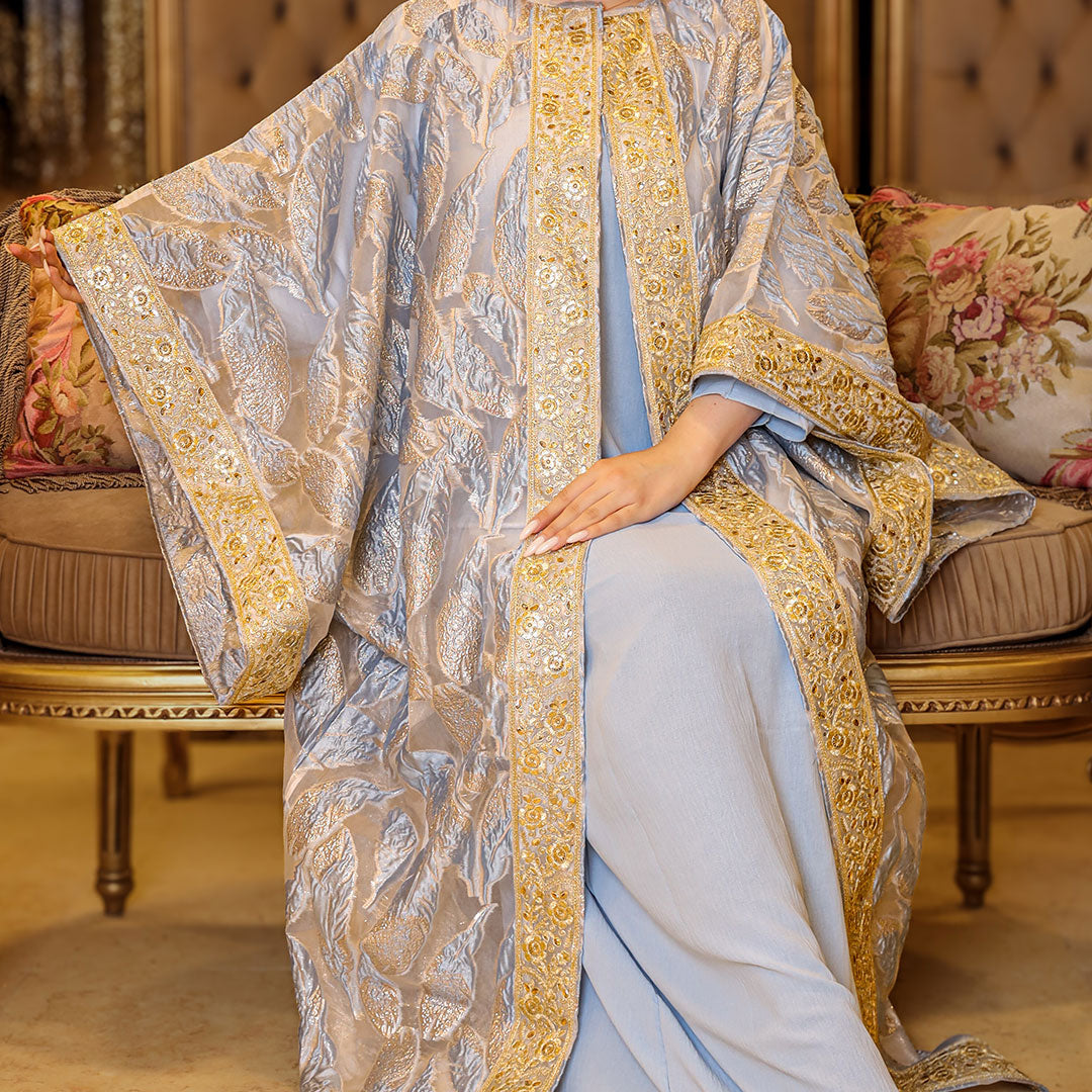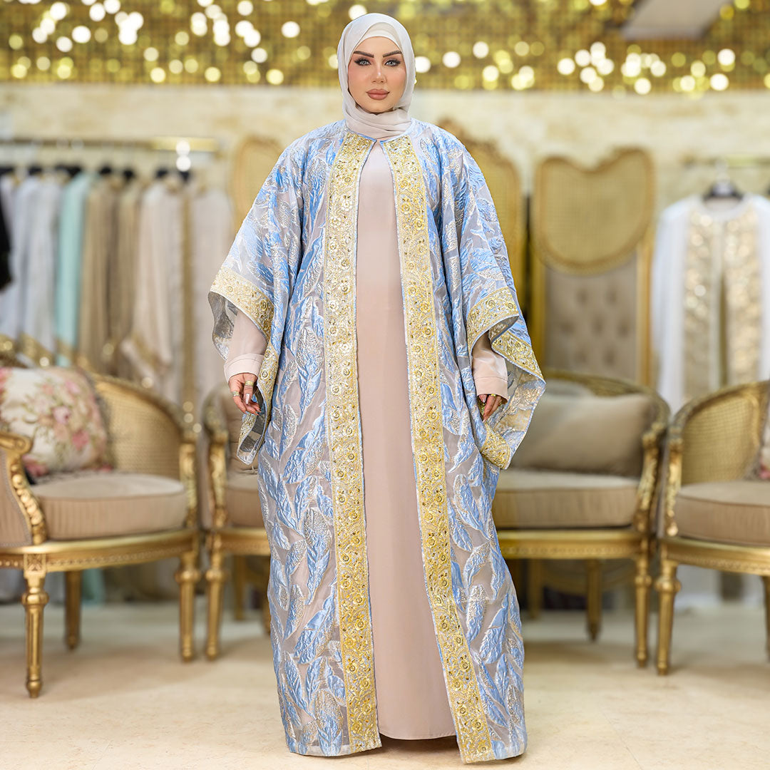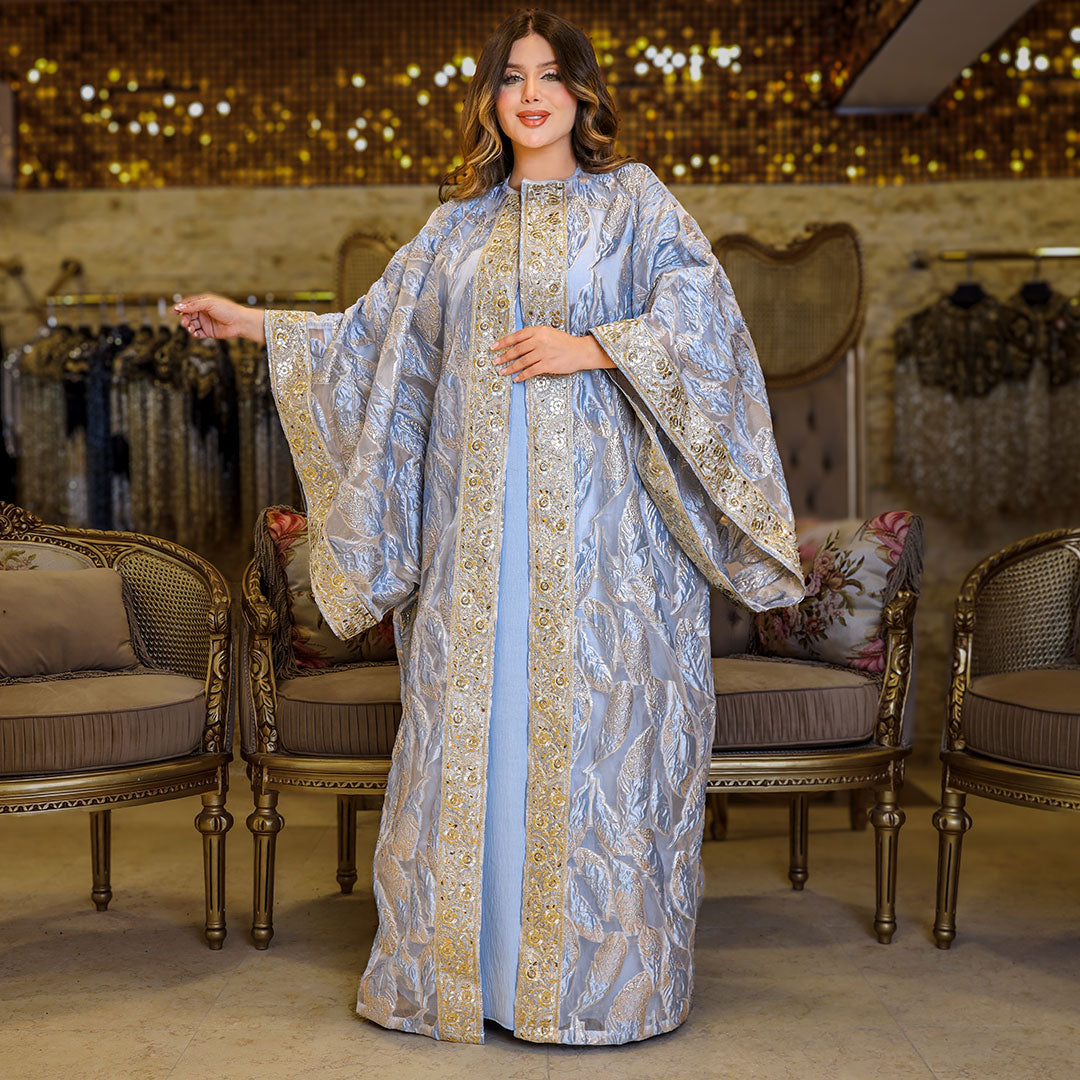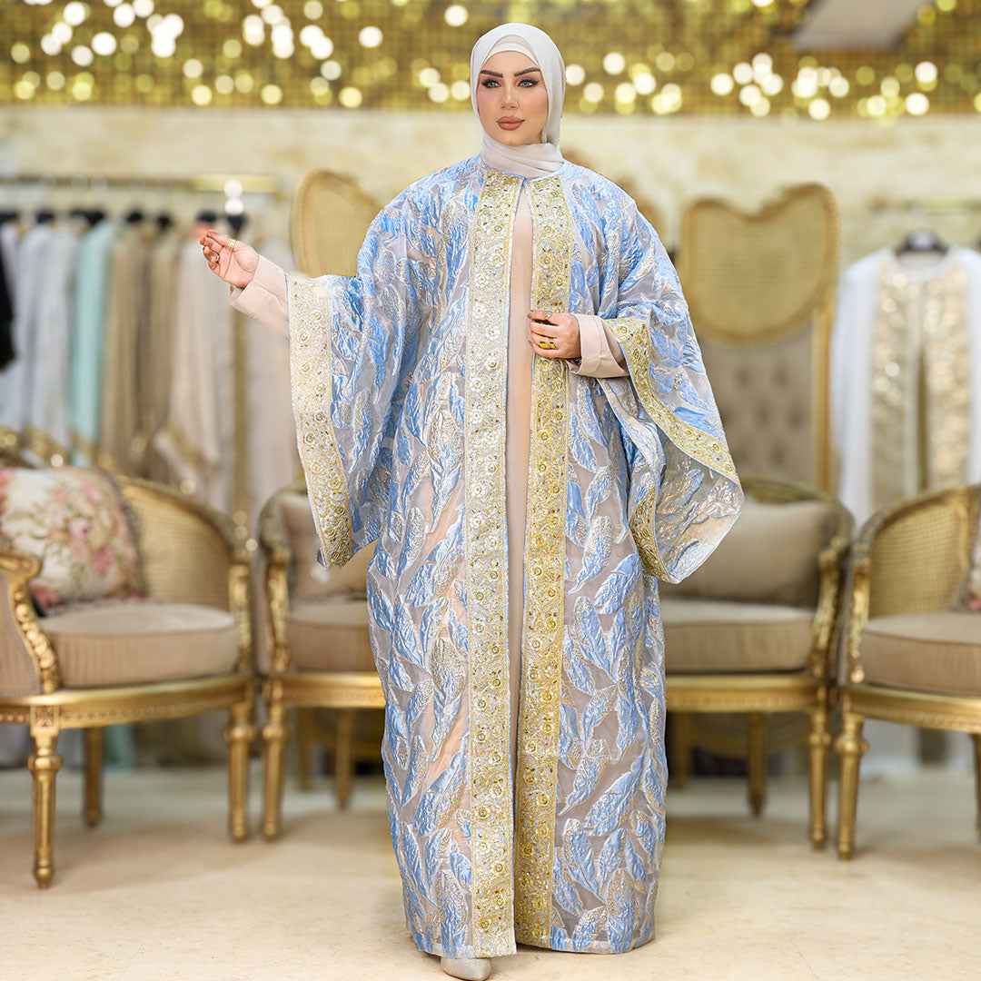 قفطان بحريني من قماش البروكار المطرز و شريط هندي تطريز - فري سايز يناسب ٧٠ك إلى ١٣٠ك