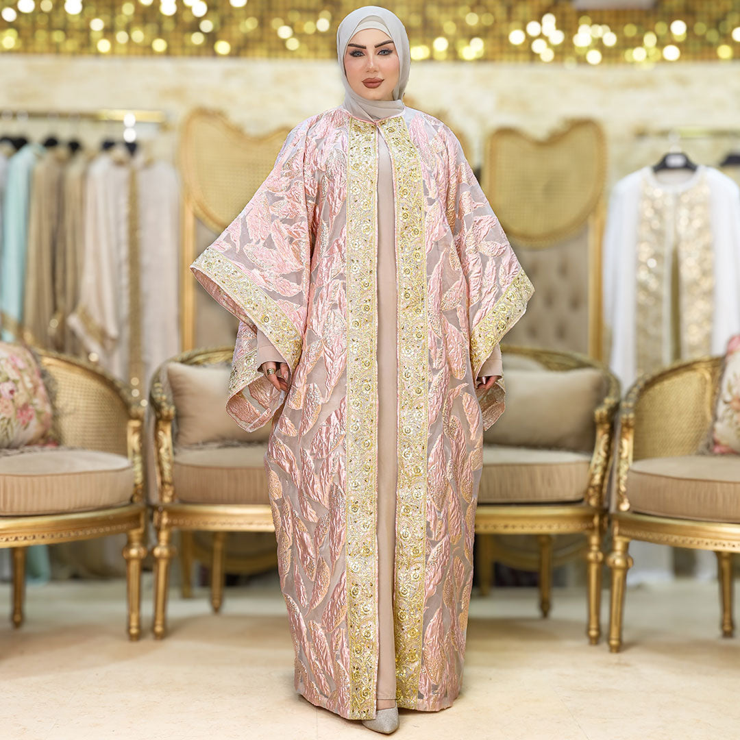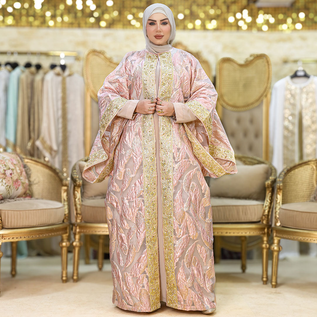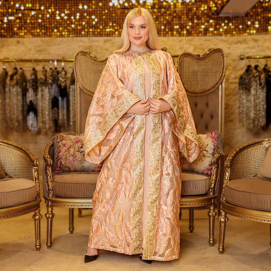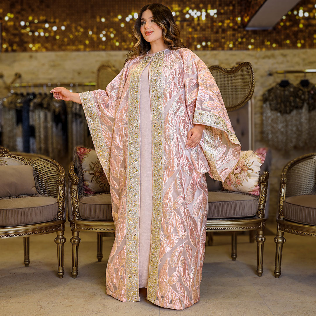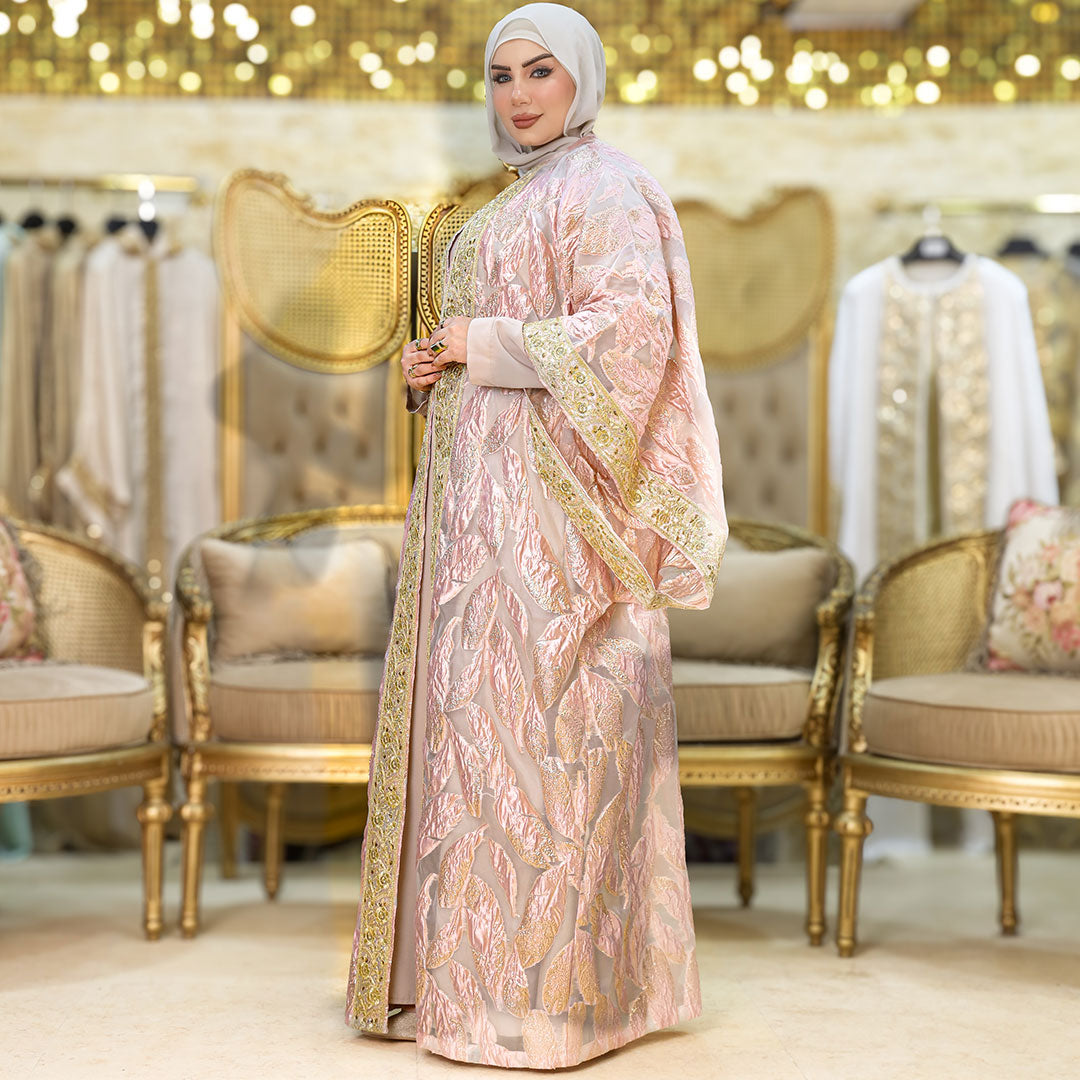 قفطان بحريني من قماش البروكار المطرز و شريط هندي تطريز - فري سايز يناسب ٧٠ك إلى ١٣٠ك