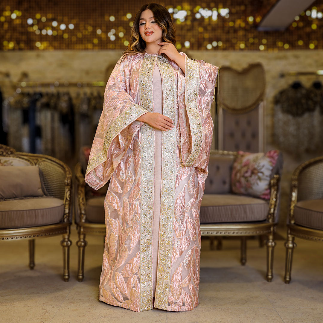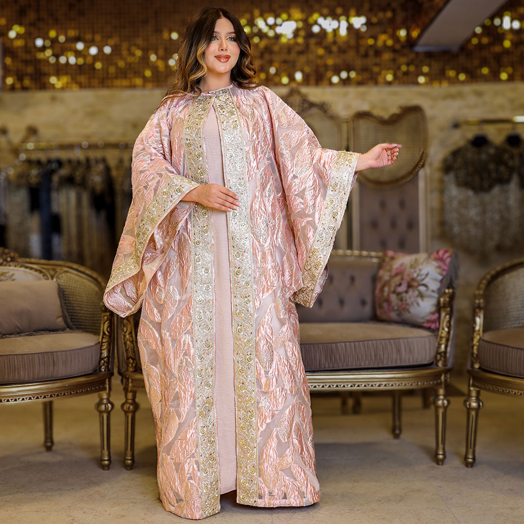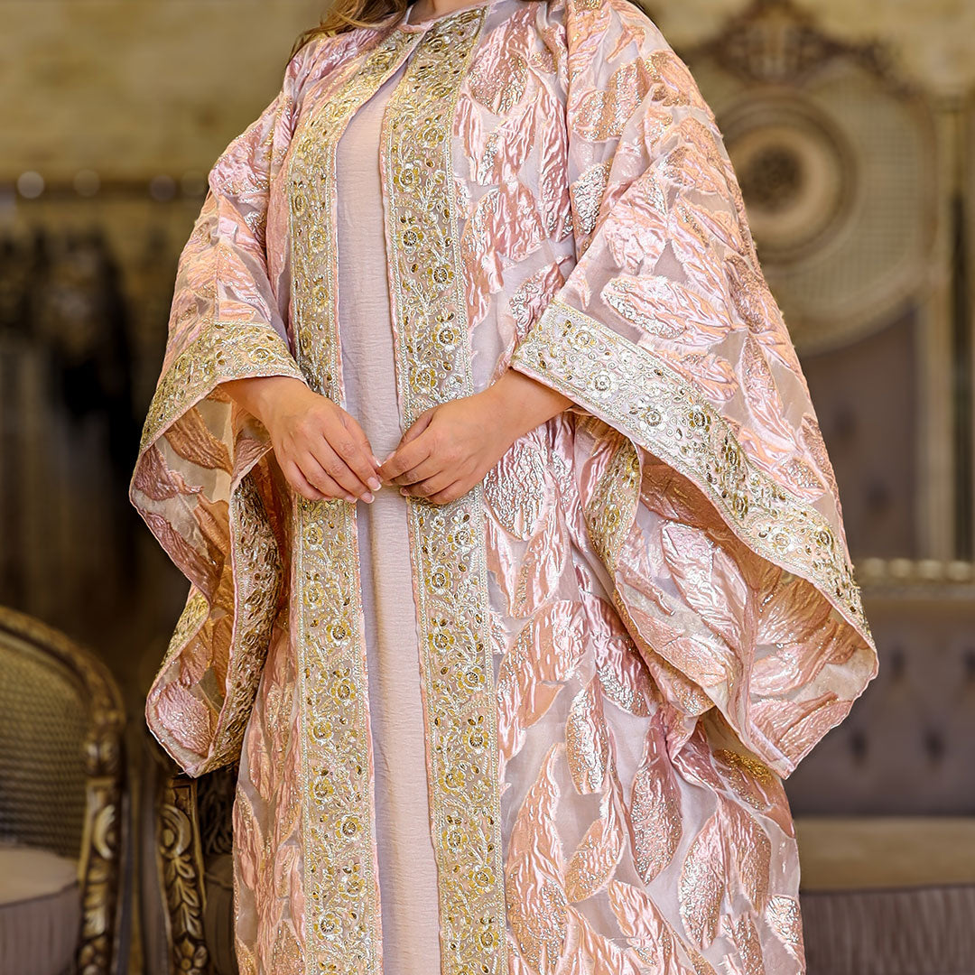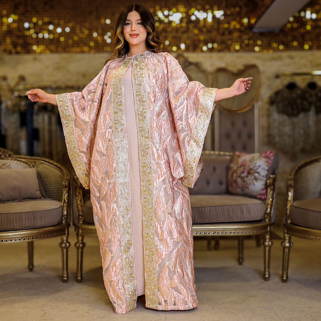 قفطان بحريني من قماش البروكار المطرز و شريط هندي تطريز - فري سايز يناسب ٧٠ك إلى ١٣٠ك