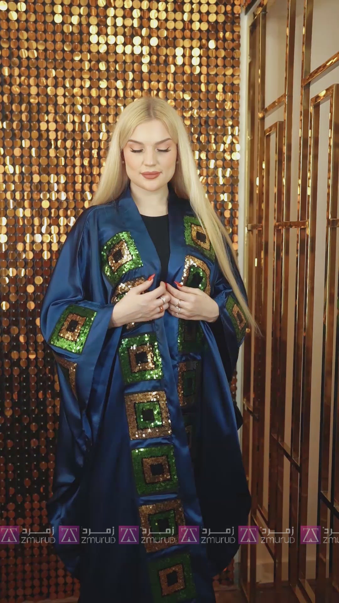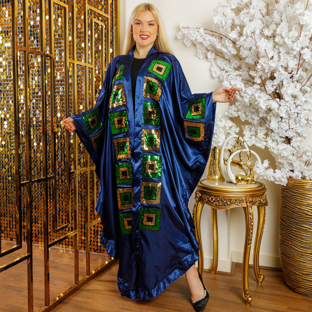 قفطان حرير ستان ناعم مزين بأباليك تطريز ترتر فري سايز يناسب ٧٠ك إلى ١٣٠ك