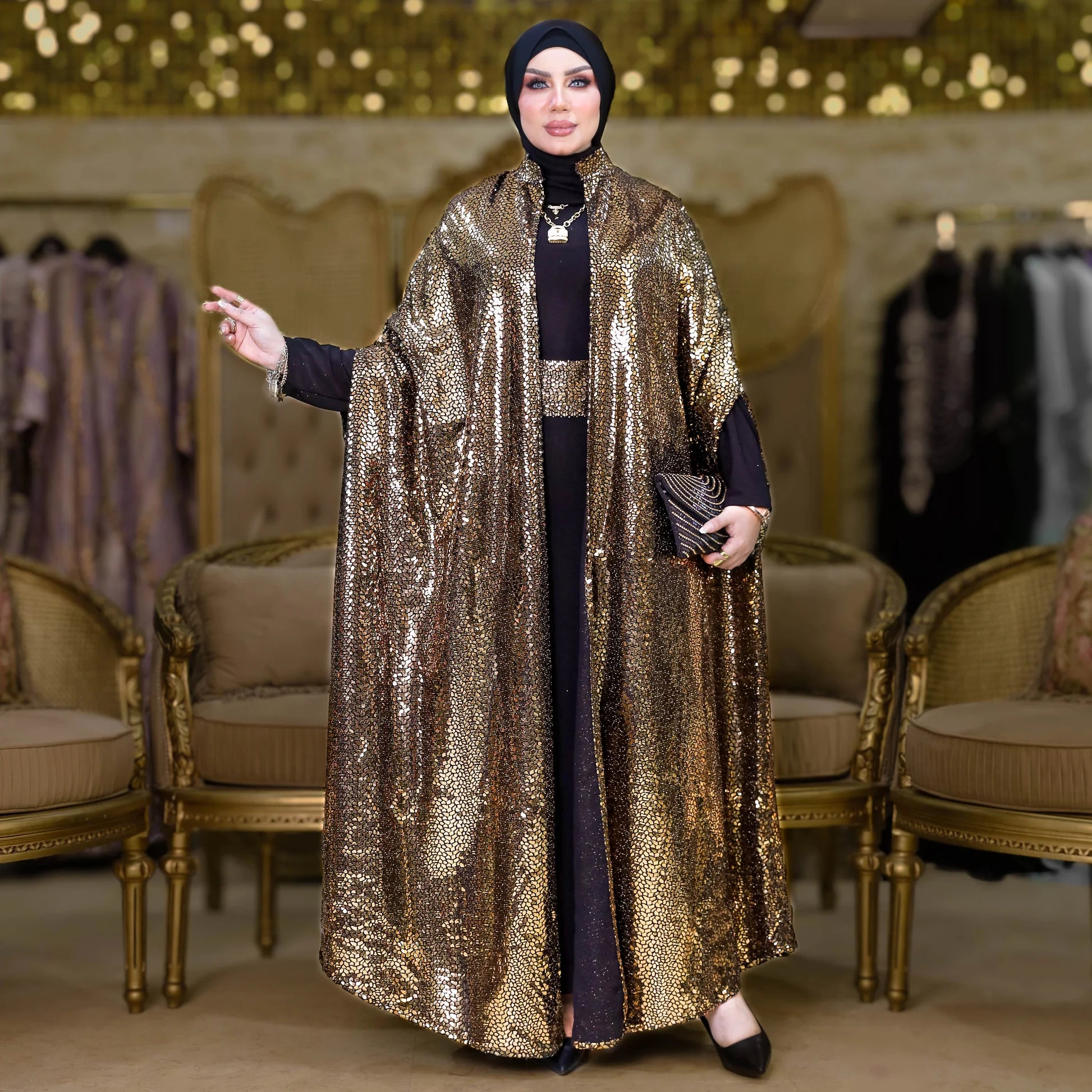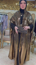 قفطان سواريه من خامة كريستال شايني + حزام لون القفطان، بدون بيزك , فري سايز يناسب ٧٠ك إلى ١٢٠ك