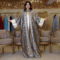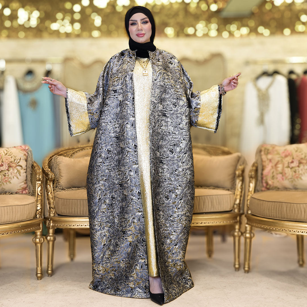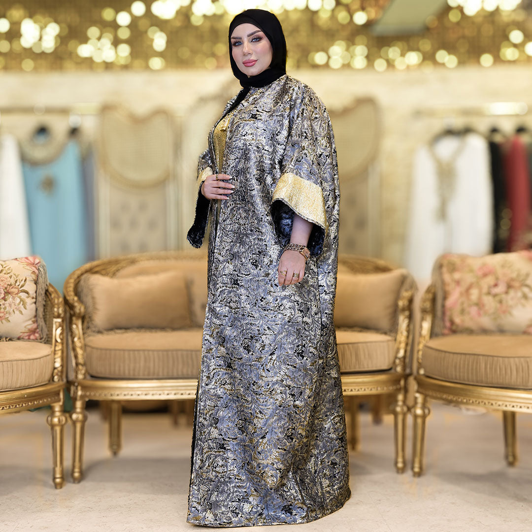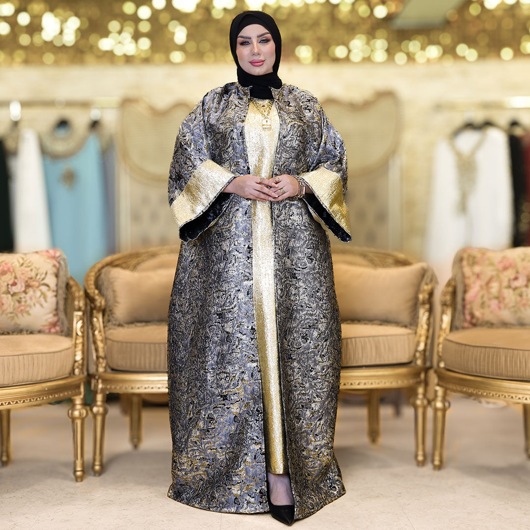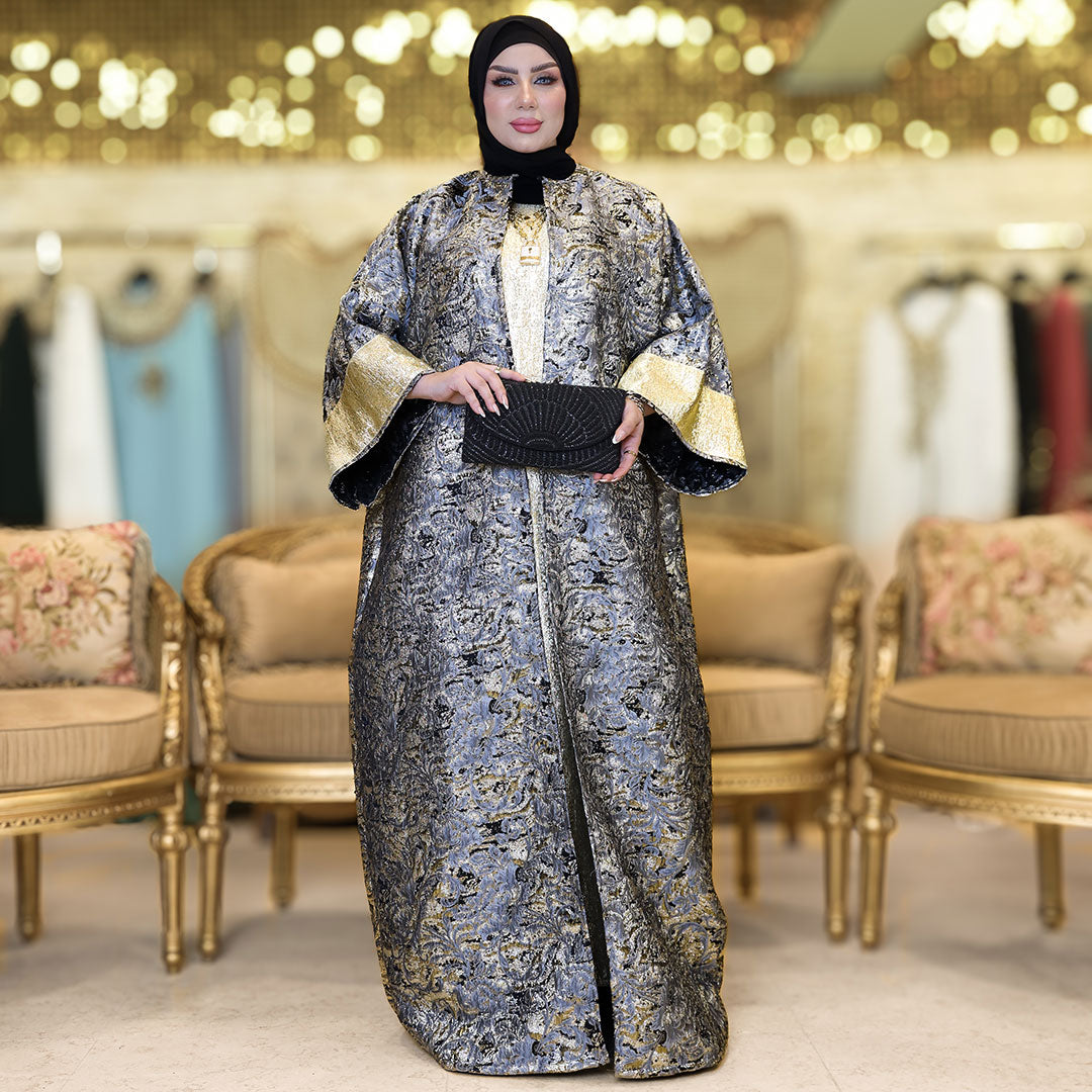 طقم قطعتين سواريه بروكار قفطان بحريني من قماش البروكار السواريه اللامع مع بيزك بروكار ذهبي فري سايز يناسب ٧٠ك إلى ١٠٠ك