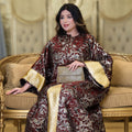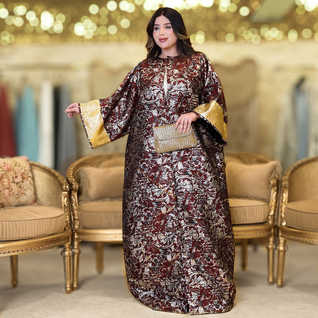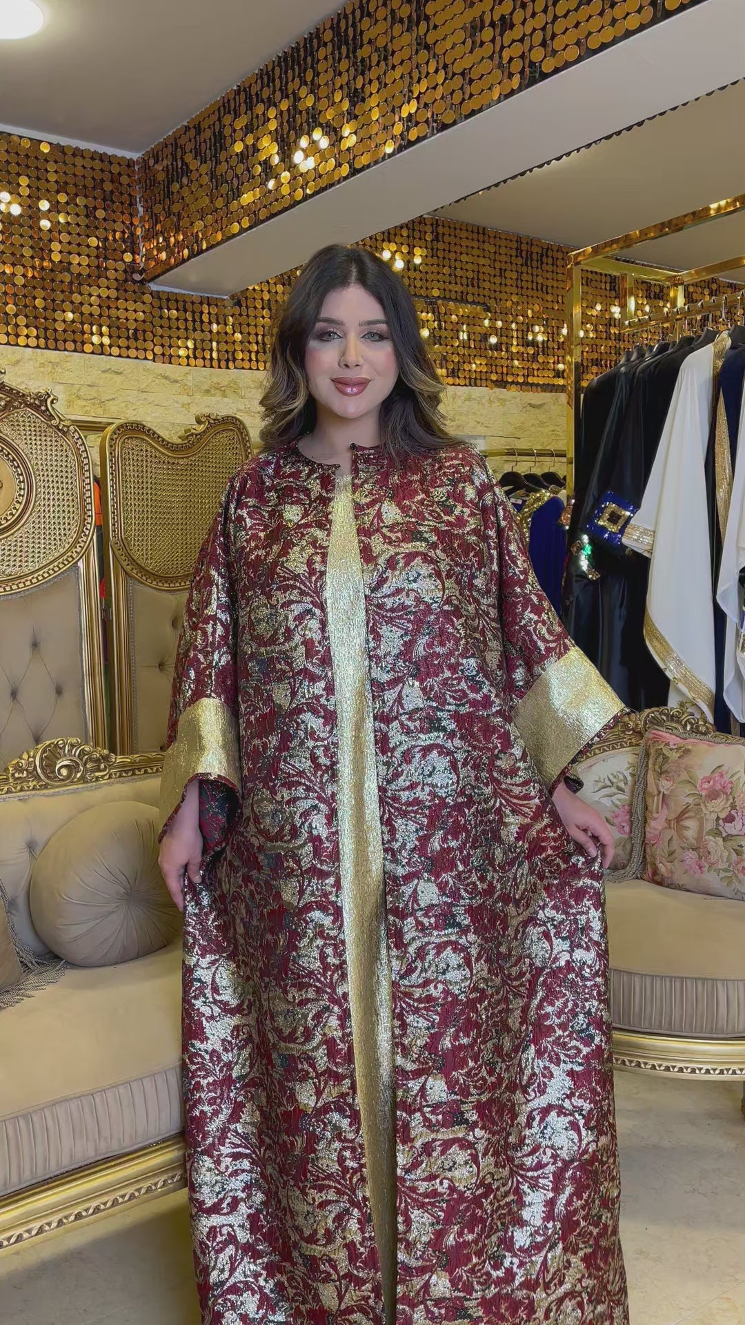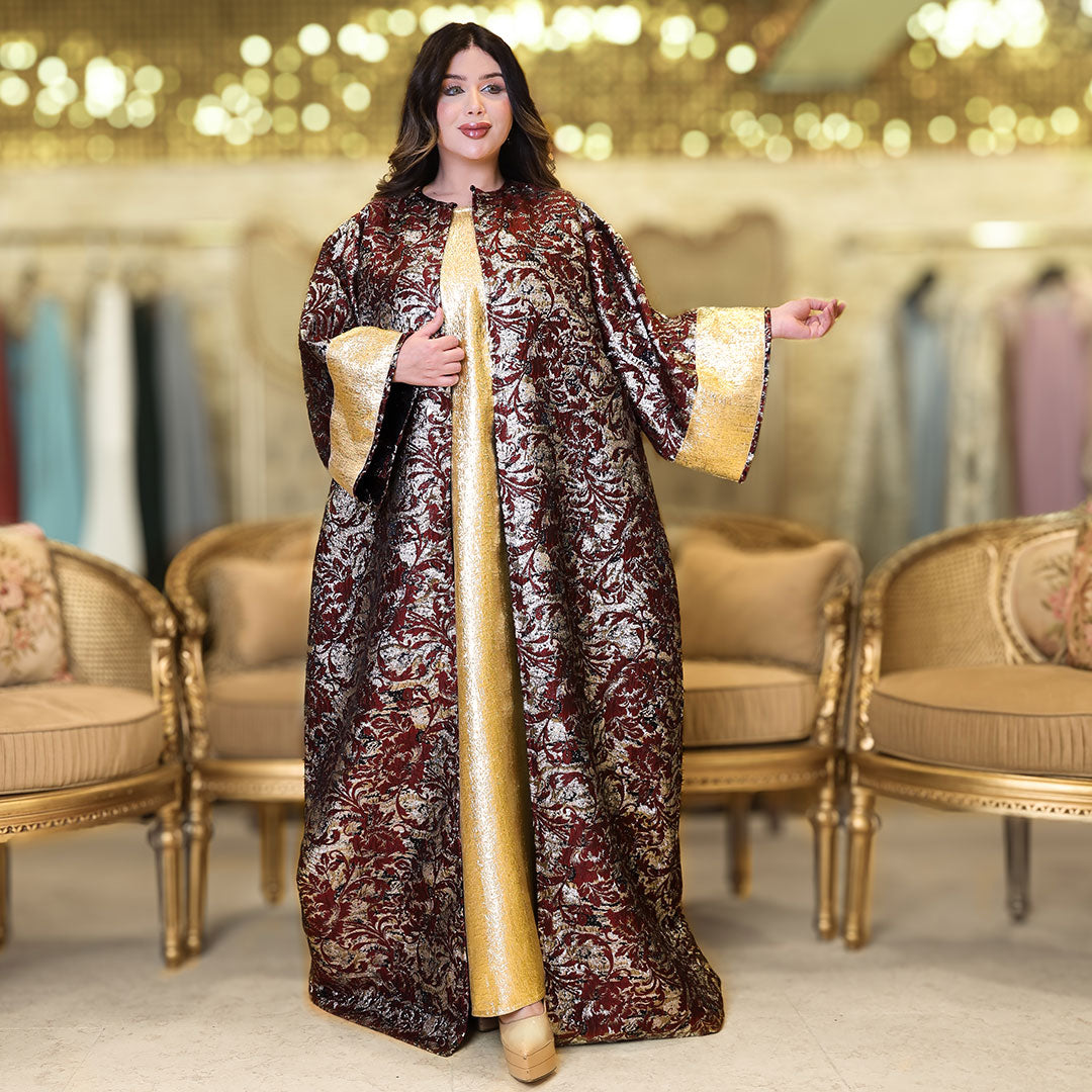 طقم قطعتين سواريه بروكار قفطان بحريني من قماش البروكار السواريه اللامع مع بيزك بروكار ذهبي فري سايز يناسب ٧٠ك إلى ١٠٠ك