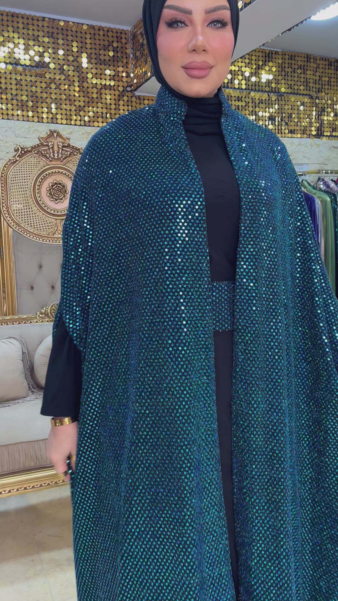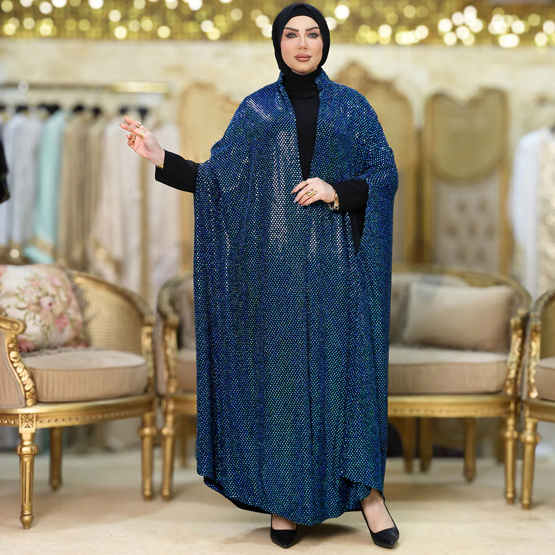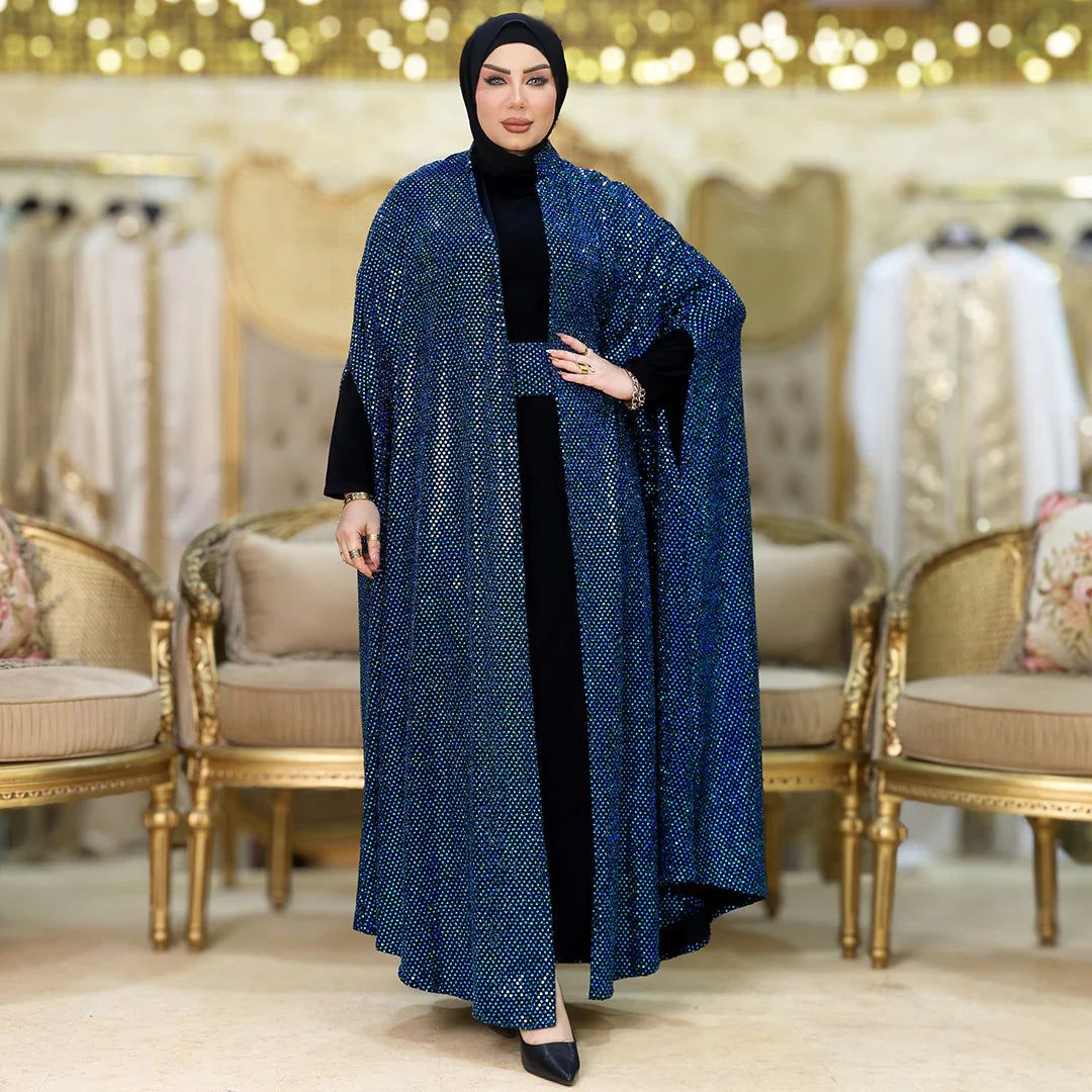 قفطان سواريه من خامة كريستال شايني + حزام لون القفطان، بدون بيزك , فري سايز يناسب ٧٠ك إلى ١٢٠ك