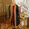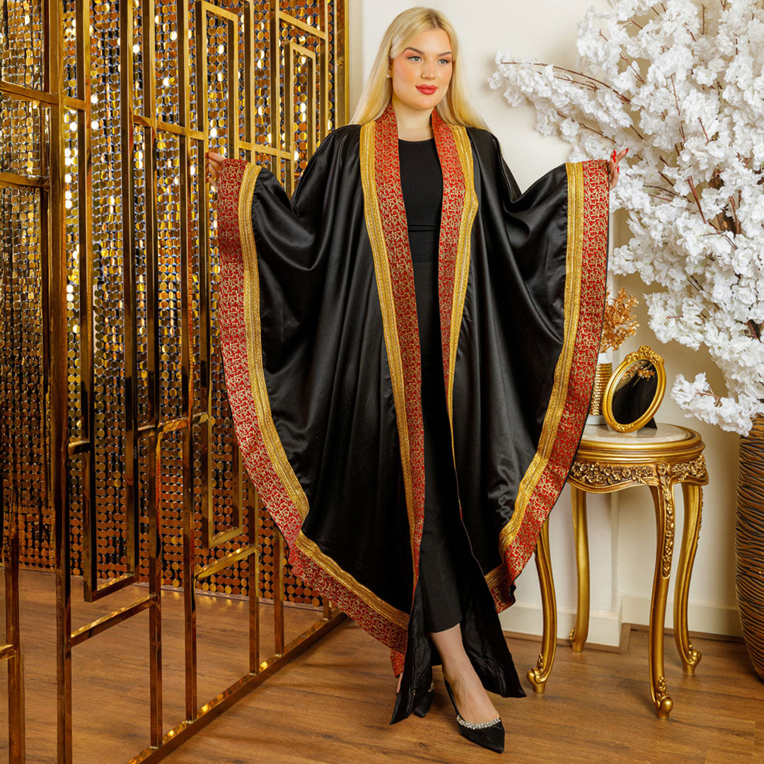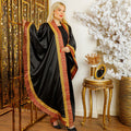 قفطان حرير ستان ناعم مزين بشرايط هندي و تطريز حروف عربي فري سايز يناسب ٧٠ك إلى ١٣٠ك