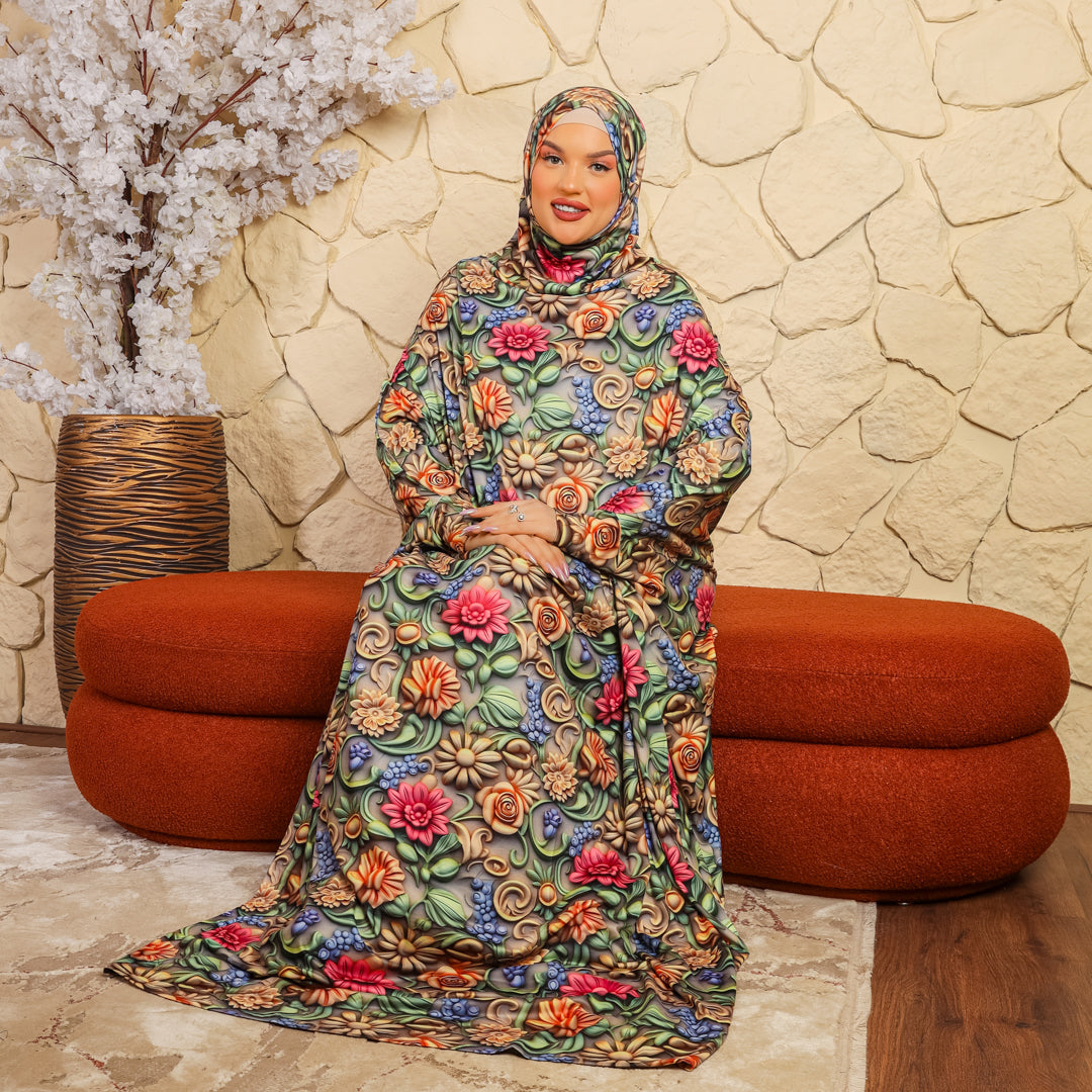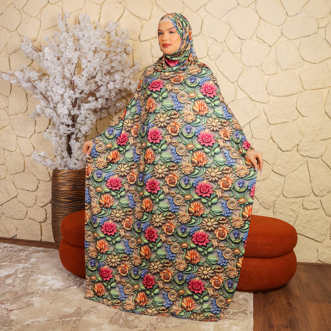 ثوب صلاة (إسدال) بحريني عملي سوفت قطن طباعة ديجيتال فري سايز يناسب من 70ك إلى 100ك مع غطاء الرأس