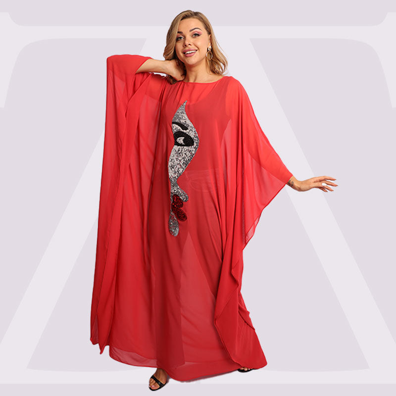 چلابية شيفون شفاف بدون بطانة بأبليك تطريز وجوه ترتر