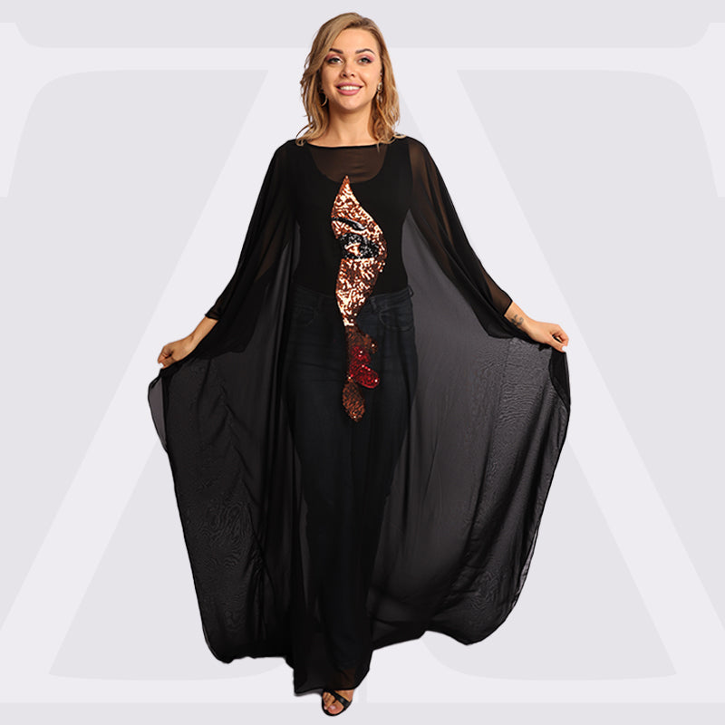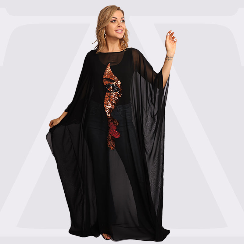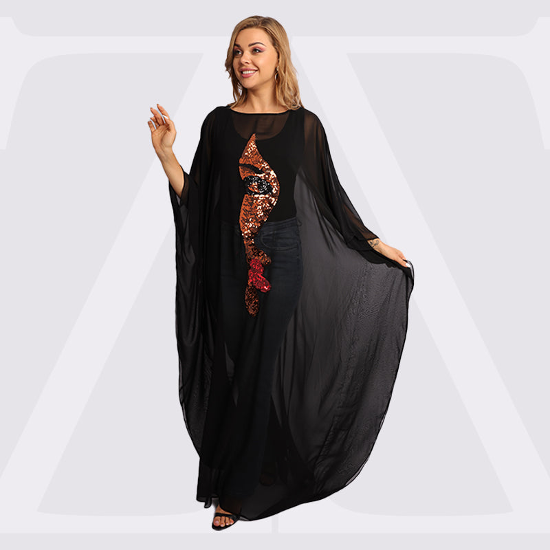 چلابية شيفون شفاف بدون بطانة بأبليك تطريز وجوه ترتر