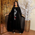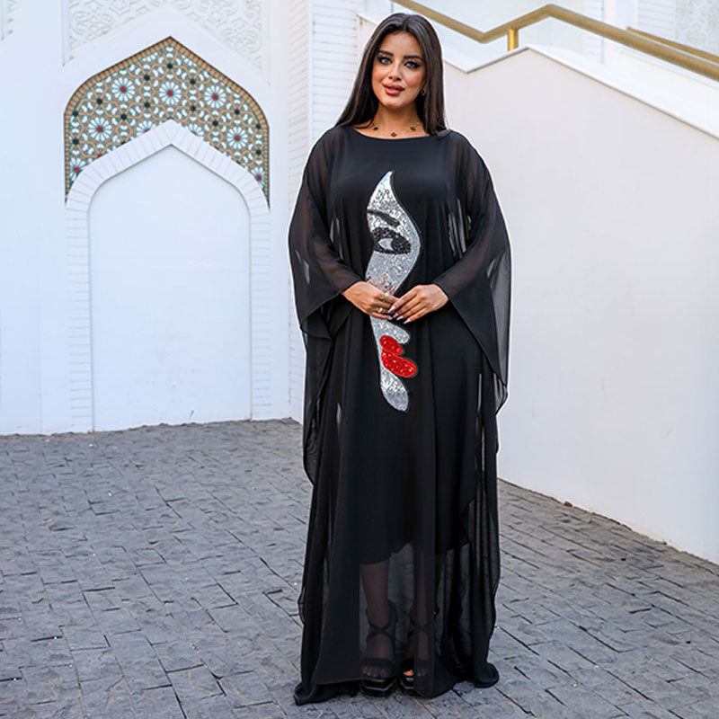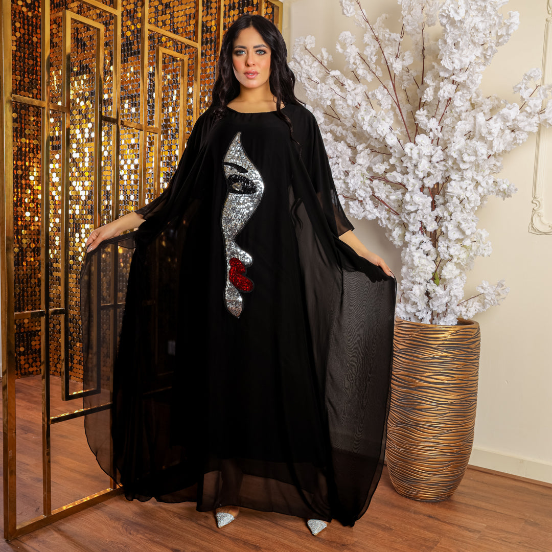 چلابية شيفون شفاف بدون بطانة بأبليك تطريز وجوه ترتر
