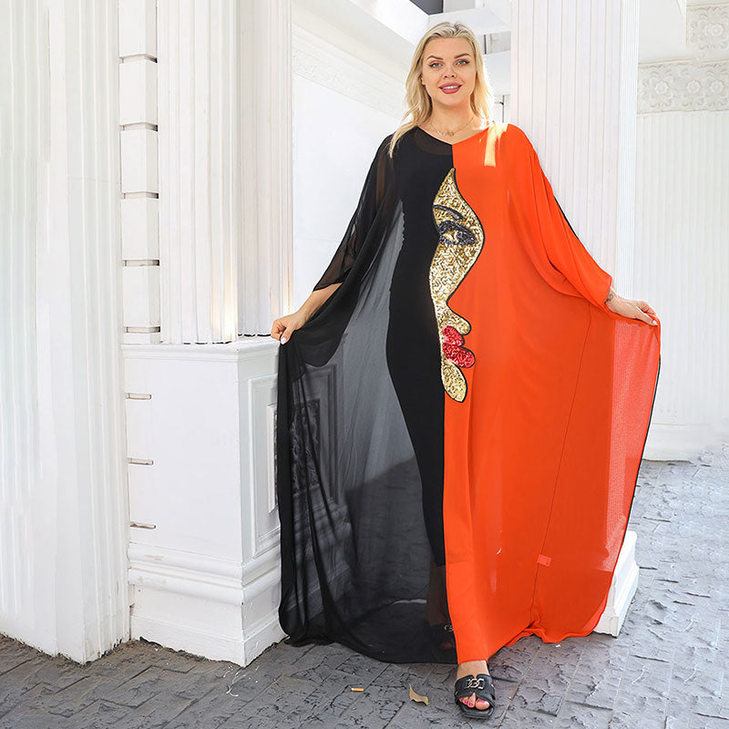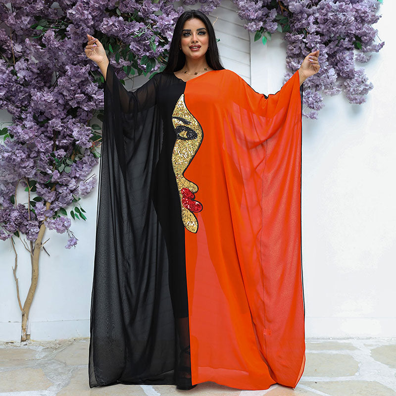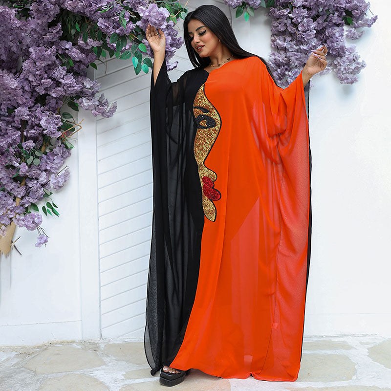چلابية شيفون شفاف بدون بطانة بأبليك تطريز وجوه ترتر