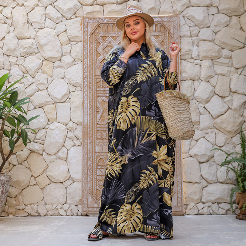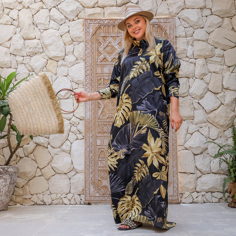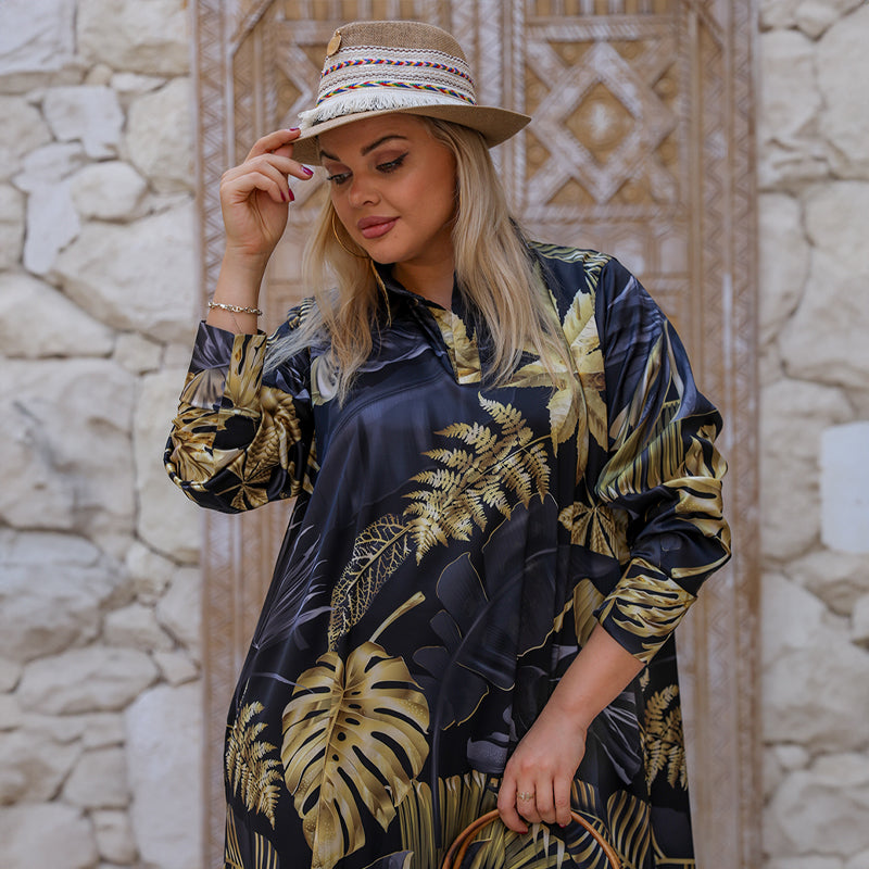 دريس حرير ستان أرماني بأكمام طباعة ديجيتال من تصميماتنا الخاصة فري سايز يناسب ٧٠ك إلى ٩٠ك و الطول من الكتف ١٤٠سم