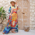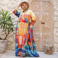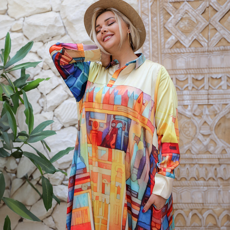 دريس حرير ستان أرماني بأكمام طباعة ديجيتال من تصميماتنا الخاصة فري سايز يناسب ٧٠ك إلى ٩٠ك و الطول من الكتف ١٤٠سم