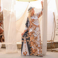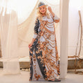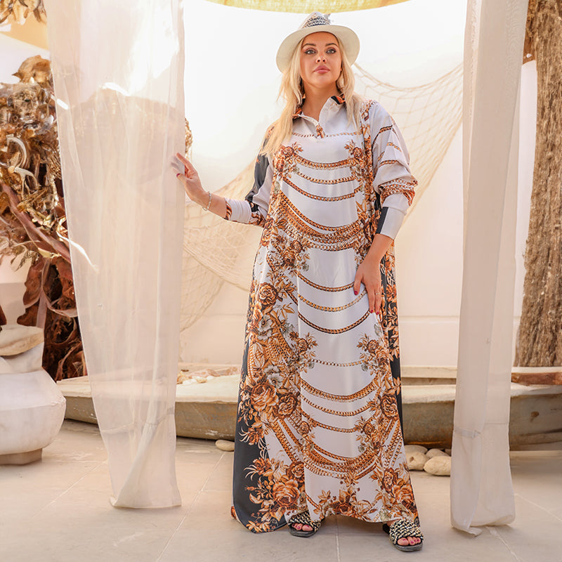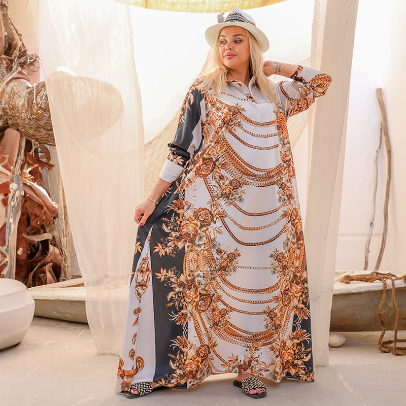 دريس حرير ستان أرماني بأكمام طباعة ديجيتال من تصميماتنا الخاصة فري سايز يناسب ٧٠ك إلى ٩٠ك و الطول من الكتف ١٤٠سم