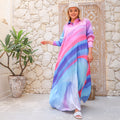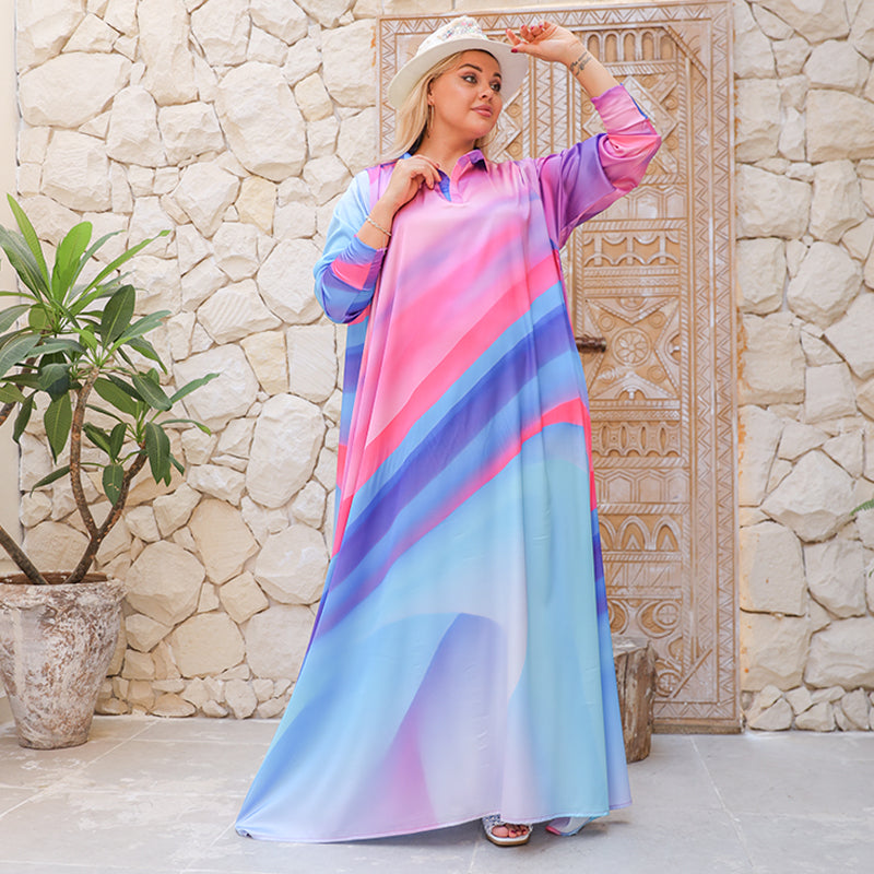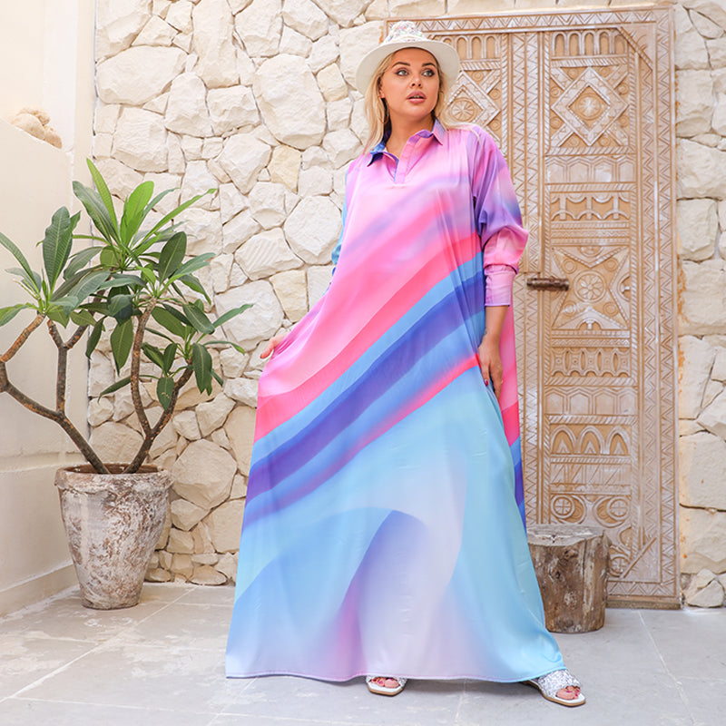 دريس حرير ستان أرماني بأكمام طباعة ديجيتال من تصميماتنا الخاصة فري سايز يناسب ٧٠ك إلى ٩٠ك و الطول من الكتف ١٤٠سم